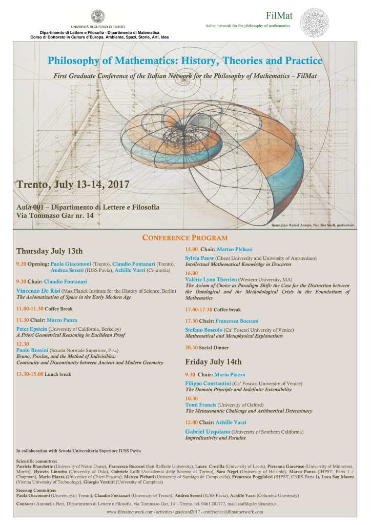 The FilMat network is now promoting its first Graduate Conference, Philosophy of Mathematics: History, Theories and Practice, that will take place on July 13-14, 2017 at University of Trento.